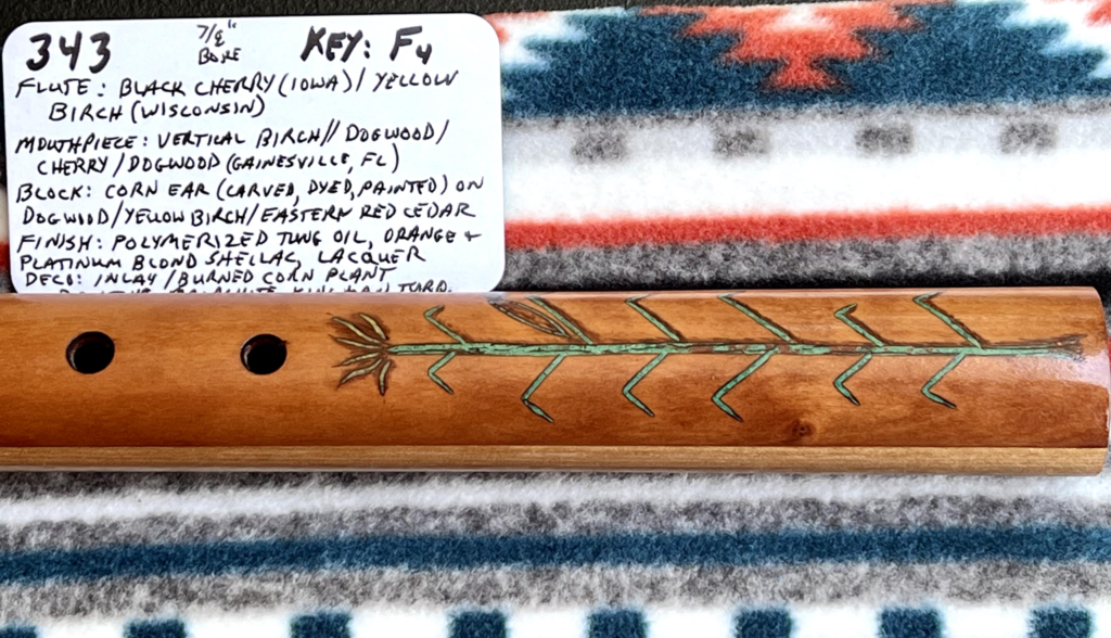 Flute 343 is a 7/8″-bore flute tuned to the key of F4. It is about 22 3/16″ long. The flute is constructed of Iowa Black Cherry paired with Wisconsin Yellow Birch. The composition mouthpiece includes Yellow Birch (vertical) // Dogwood / Cherry / Dogwood. The Dogwood came from a tree which grew in our daughter’s front yard. The Yellow Birch grew at a friend’s property in eastern Wisconsin. The block has a Corn ear carving (Cherry with Yellow/Cyan aniline dye and painted/wood burned kernels) on a base of Dogwood / Yellow Birch / Eastern Red Cedar.